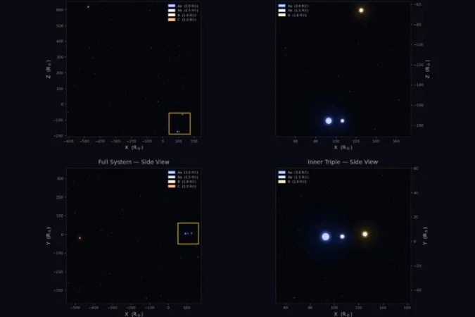 Foi preciso olhar mais de perto, escavar os gráficos de luz entre 2019 e 2024, e usar espectroscopia avançada para revelar a verdade: não eram duas estrelas. Eram três. E logo depois, o padrão indicou a assinatura gravitacional fantasma de um quarto corpo massivo. O TIC 120362137 revelou-se como o sistema quádruplo do tipo “3+1” mais compacto já registrado pela humanidade.