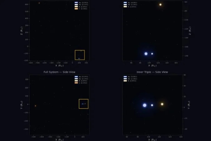 Para entender a magnitude da bizarrice, precisamos usar nossa própria vizinhança como escala. No nosso sistema solar, Mercúrio leva rápidos 88 dias para dar uma volta ao redor do Sol. A distância entre eles é modesta em termos espaciais. Agora, imagine pegar três estrelas completas — todas maiores, mais massivas e muito mais quentes que o nosso Sol — e espremê-las dentro desse espaço diminuto da órbita de Mercúrio. É um verdadeiro “mosh pit” cósmico de radiação e gravidade.