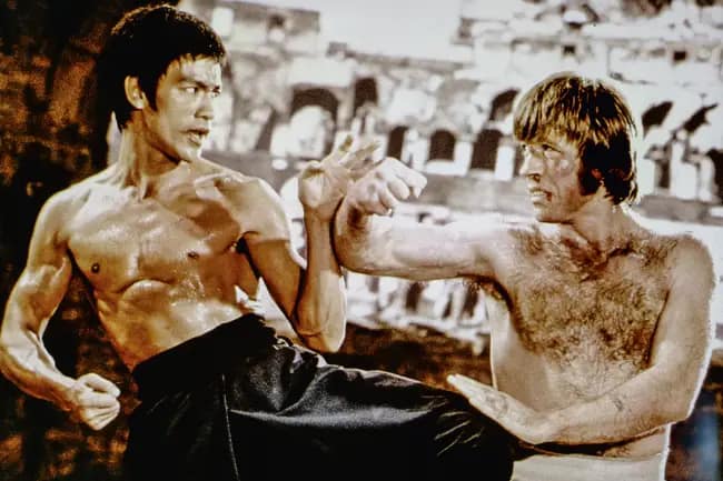 Seu salto do mundo das lutas para o estrelato mundial teve a mãozinha de outro titã: Bruce Lee. Os dois se conheceram em competições de artes marciais e desenvolveram um respeito mútuo profundo. Esse laço culminou em uma das cenas de luta mais icônicas da história do cinema, o combate épico no Coliseu de Roma no filme “O Voo do Dragão” (1972). A coreografia brutal e crua entre Lee e Norris definiu o padrão ouro para os filmes de artes marciais e cravou o nome do americano em Hollywood.